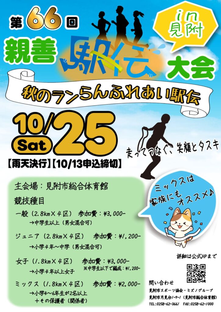 部門 | ①一般の部(2.8km×4区) ②ジュニアの部(2.8km×4区) ③女子の部(1.8km×4区) ④ミックスの部(1.8km×4区) |