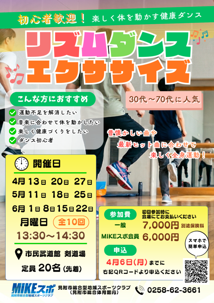 | 内容 | ◎リズムダンスエクササイズ(昼) 音楽に合わせて、体も気分もリズムアップ! はじめてのリズムダンスエクササイズは、やさしく楽しく全身運動。 毎日の動きやすさと、ちょっとした自信を手に入れられる教室です。 |