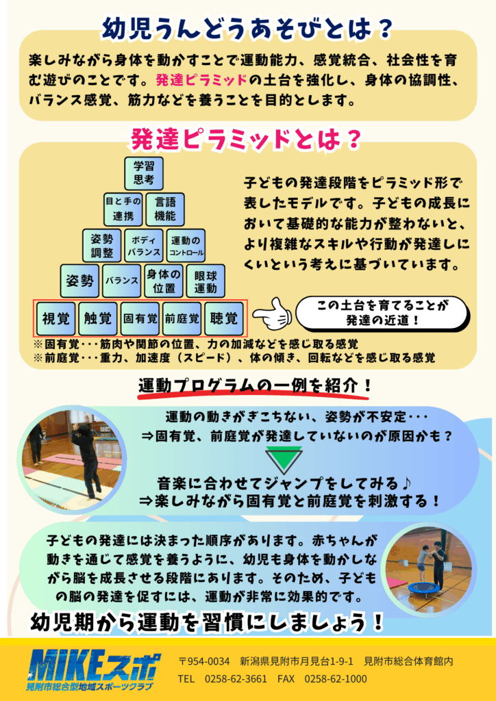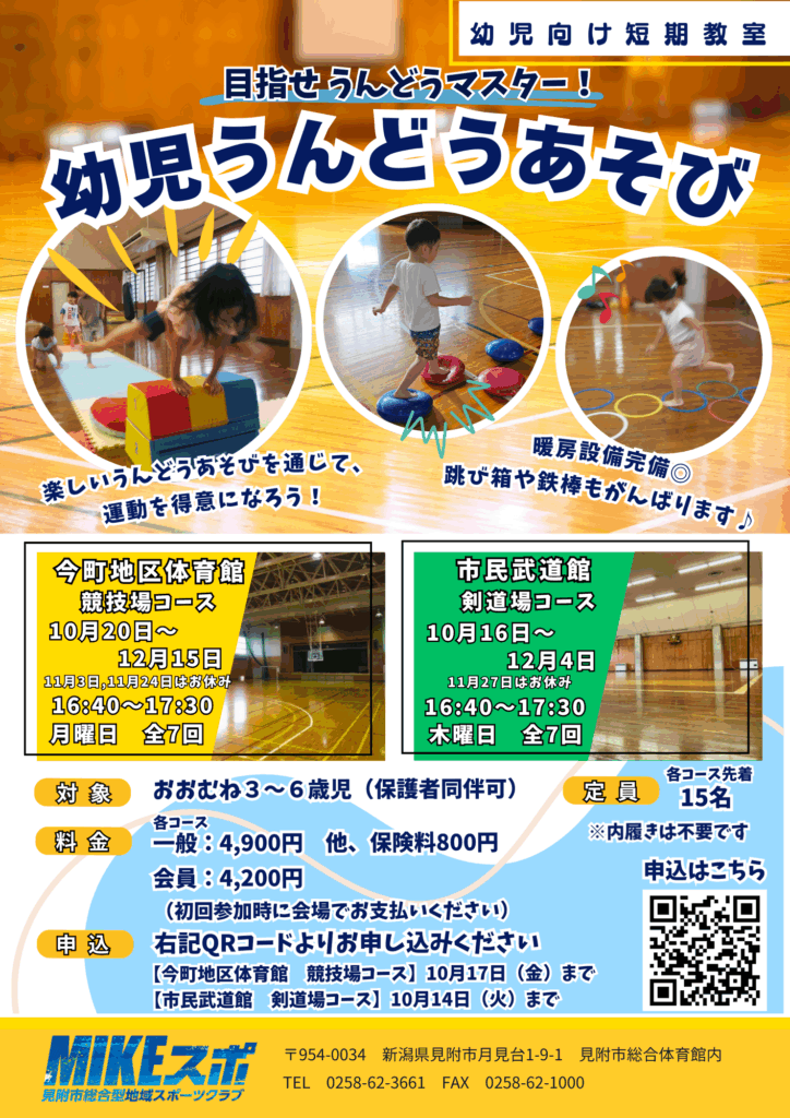 【まもなく定員!】幼児うんどうあそび教室 2025年10月11日(土) 最終更新日時 : 2025年10月11日(土) mitsuke-sports-edit FacebookXBlueskyCopy 【3~6歳児対象】目指せうんどうマスター! 楽しいうんどうあそびを通じて、運動を得意になろう♪会場は空調設備がありますので、快適な環境で運動できます!【メニュー】〇サーキット遊び(鉄棒・跳び箱など)〇コーディネーション遊び(スカーフキャッチなど)〇リズム運動〇ルールのある遊び(鬼ごっこなど) 運動が苦手でもしっかりサポートします!まもなく定員に達します。申し込みはお早めに!詳細は下記をご覧ください。 お申し込みはコチラ