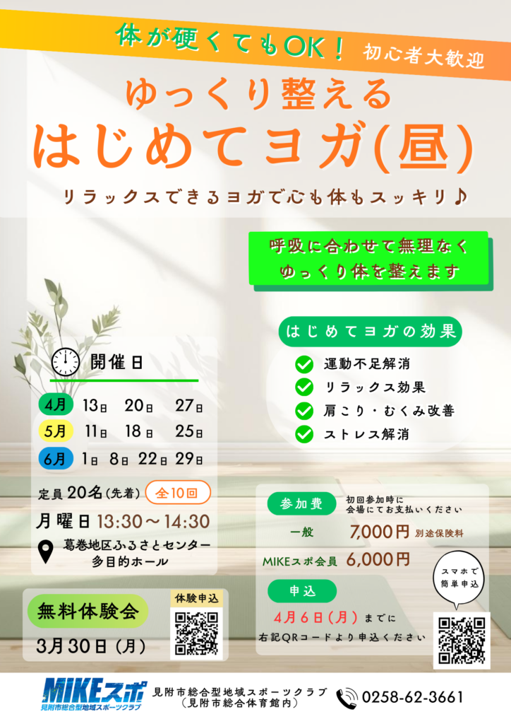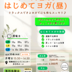 | 内容 | ◎はじめてヨガ(昼) はじめての方でも安心して参加できるヨガ教室。 呼吸とやさしい動きを大切にしながら、体をゆっくり整えていきます。 無理なく続けることで、心と体のバランスを整え、日常を快適に過ごせる身体づくりを目指します。 |